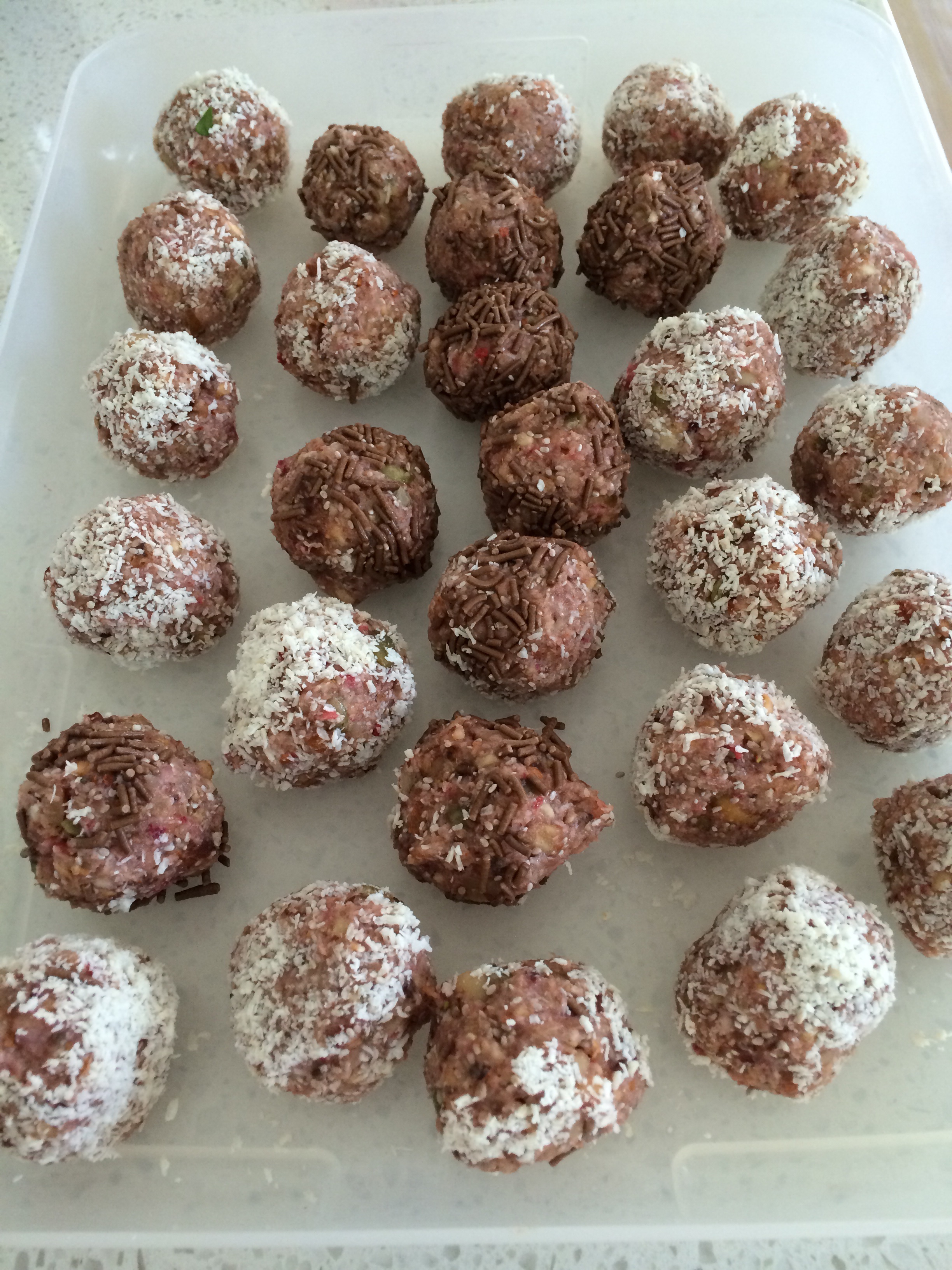 These raw vegan sugar free bliss balls are made from medjool dates, banana, strawberries, activated nuts, chia seeds, and coconut. Used thermomix to blitz the dates first, then added the other ingredients. Pulsed a few times. Shaped into balls and rolled in desiccated coconut and refrigerated for 20 minutes to firm up. Rolled a few in chocolate hail for kids. But they were happy to eat the sugar free ones. Delicious and a great alternative to biscuits and cake. Recipe from Pete Evans Paleo Family Food cookbook. Strawberry bliss ball link http://www.recipecommunity.com.au/desserts-sweets-recipes/strawberry-bliss-balls/232564