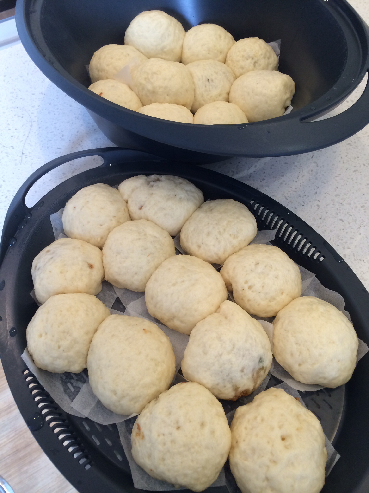 - Place Varoma tray on tmx, steam buns 10 mins, Varoma temp, speed 3.