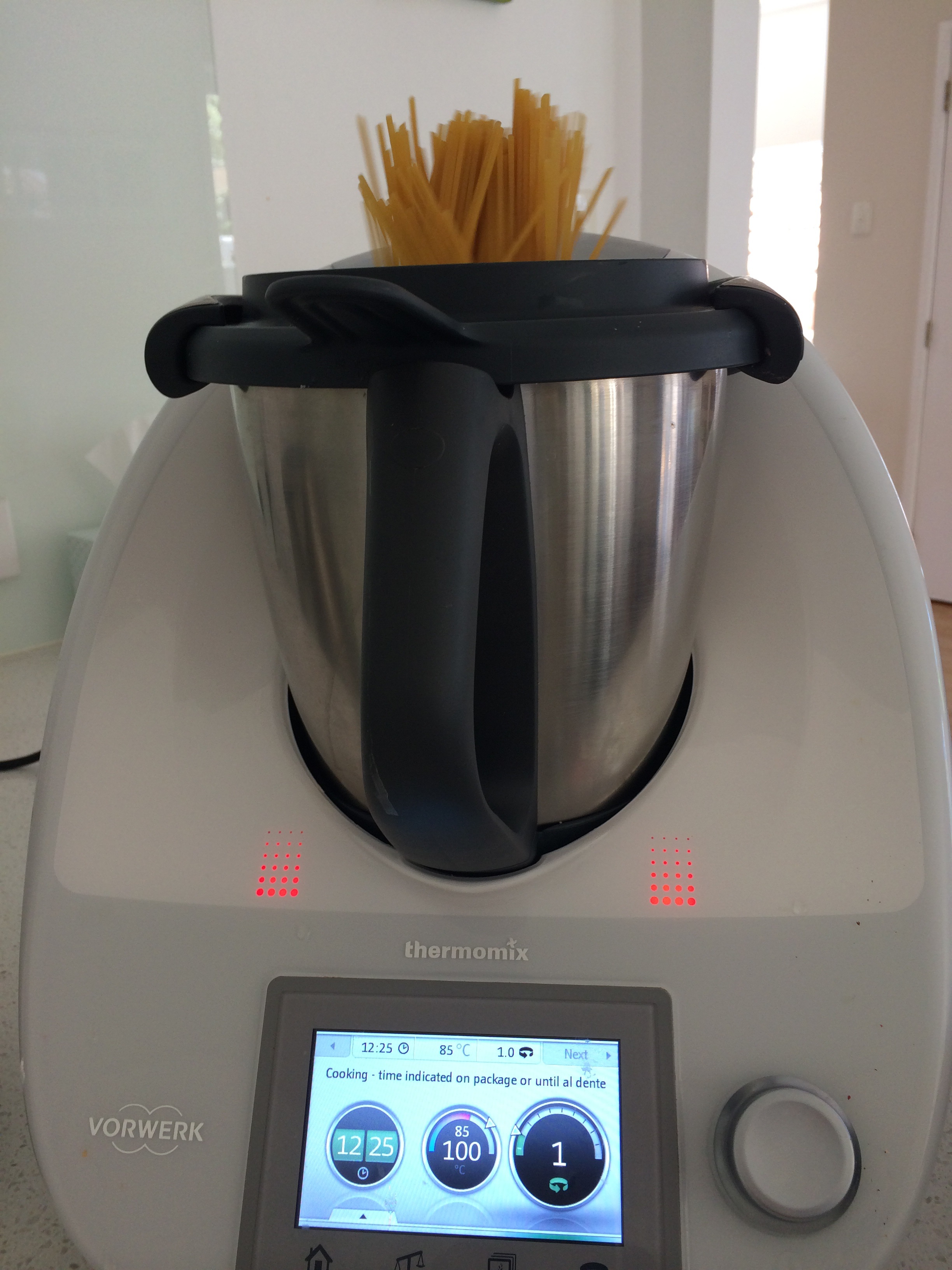 The great thing about boiling pasta in the thermomix is not having to watch the pot making sure it doesn’t boil over. I added preboiled water, added the pasta, then set the timer, walk away. Very convenient.